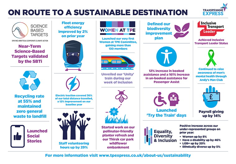 Our approach to sustainability is defined by understanding our contribution to society, the economy, and the environment, and what is materially important to our colleagues, our customers, and our stakeholders. A key focus is to prioritise where our efforts can have the biggest positive impact to meet customer needs, levelling up and connectivity, delivering environmental, social, and financial sustainability across TPE operations.